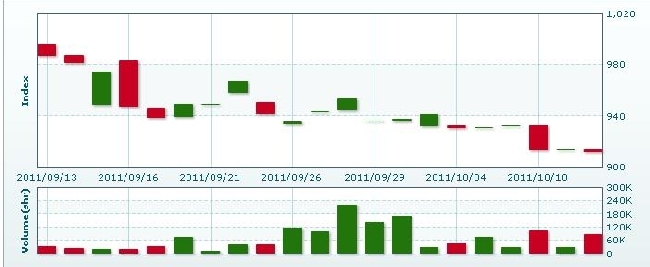 10月14日のラオス総合指数は1.11ポイント(0.12%)下落し、912.68で取引を終えた。売買高は前日比184.6%増の8万4747株、売買代金は同179.3%増の3億6977万キープだった。