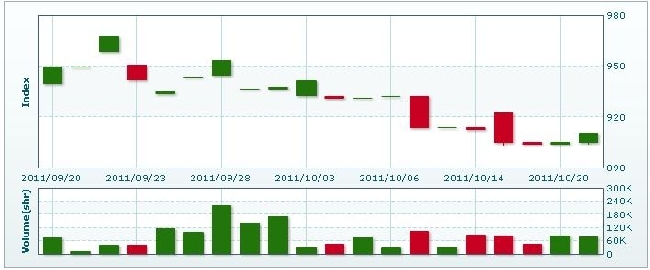 10月21日のラオス総合指数は5.54ポイント(0.61%)上昇し、910.53で取引を終えた。売買高は前日比6.1%減の7万6906株、売買代金は同4.1%増の3億9806万キープだった。