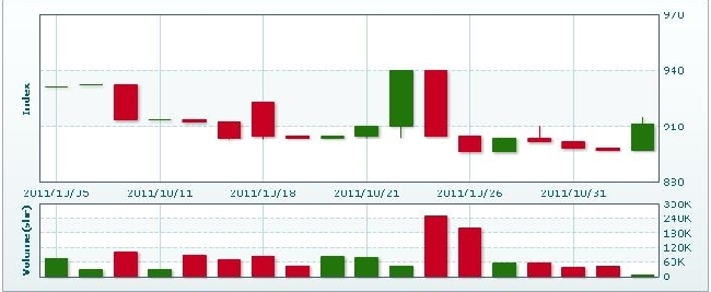 11月4日のラオス総合指数は17.60ポイント(1.91%)下落し、904.99で取引を終えた。売買高は前日比0.9%増の15万2624株、売買代金は同4.8%減の10億2676万キープだった。