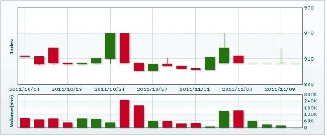 11月11日のラオス総合指数は16.49ポイント( 1.82%)上昇し、921.48で取引を終えた。売買高は前日比大幅に増加となる10万3010株、売買代金は7億4697万キープだった。