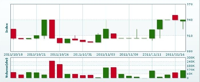 11月17日のラオス総合指数は前日比変わらずの940.18で取引を終えた。売買高は前日比44.6%増の11万1581株、売買代金は同34.1%増の5億0408万キープだった。