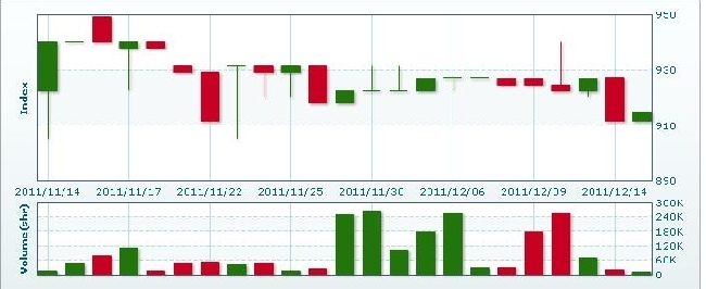 12月15日のラオス総合指数3.32ポイント(0.36%)上昇し、914.90で取引を終えた。売買高は前日比49.6%減の1万0352株、売買代金は同41.9%減の5984万キープだった。