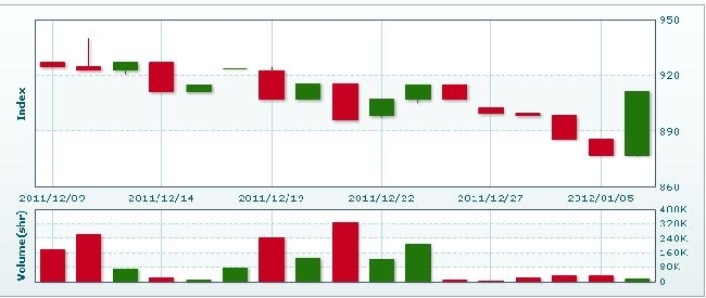 1月9日のラオス総合指数は20.86ポイント(2.29%)下落し、890.66で取引を終えた。売買高は先週末比61.2%増の2万3042株、売買代金は同3.0%増の9640万キープだった。