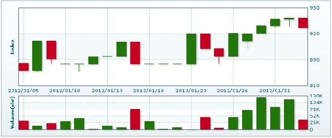 LSX総合指数は今週2.21ポイント下落した。月曜日から金曜日まで5営業日を合計した売買高は39万8285株、売買代金は18億9055万キープだった。1営業日当たりの売買高は7万9657株、1営業日当たりの売買代金は3億7811万キープだった。