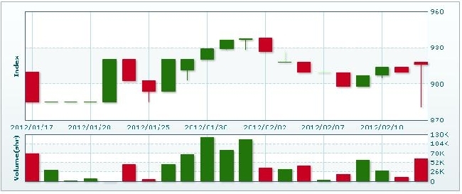 2月15日のラオス総合指数は9.91ポイント(1.08%)下落し、905.93で取引を終えた。売買高は前日比69.2%減の1万9175株、売買代金は同71.4%減の8838万キープだった。