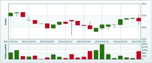 2月29日のラオス総合指数は7.69ポイント(0.83%)下落し、915.84で取引を終えた。売買高は前日の7倍となる10万3162株、売買代金は前日の6倍、5億1140万8800キープだった。