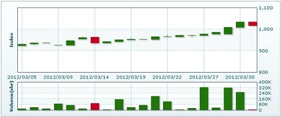 4月2日のラオス総合指数は先週末比15.63ポイント(1.51%)下落し、1017.55で取引を終えた。。売買高は先週末比99.5%減の1377株、売買代金は同99.4%減の823万5000キープだった。