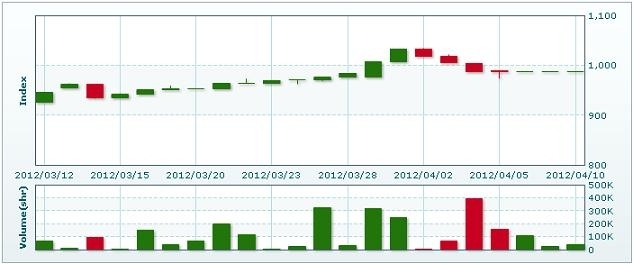 4月11日のラオス総合指数は2.67ポイント(0.27%)上昇し、990.29で取引を終えた。売買高は前日比23.8%減の3万0300株、売買代金は同23.7%減の1億4562万キープだった。