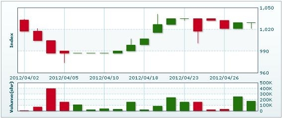 5月2日のラオス総合指数は7.15ポイント(0.69%)下落し、1022.4で取引を終えた。売買高は前日比49.2%減の8万9632株、売買代金は同44.8%減の5億1568万キープだった。