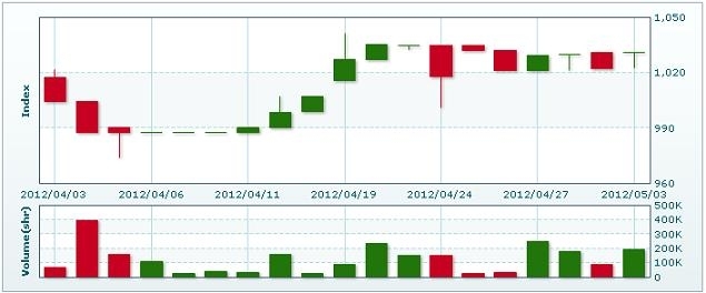 5月4日のラオス総合指数は1.34ポイント(0.13%)上昇し、1032.22で取引を終えた。売買高は前日比34.6%減の12万6504株、売買代金は同34.7%減の6億4624万キープだった。