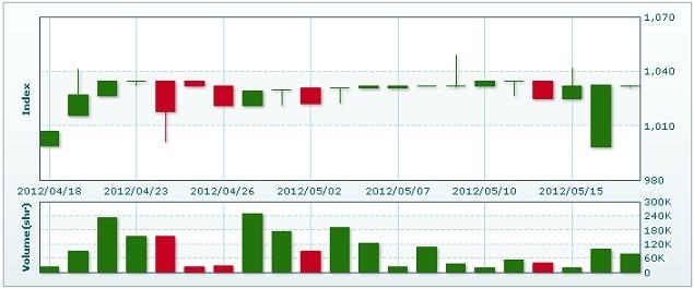 5月18日のラオス総合指数は11.15ポイント(1.08%)下落し、1021.07で取引を終えた。売買高は前日比40.1%増の11万株、売買代金は同38.9%増の7億4800万キープだった。