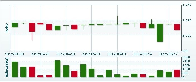 5月21日のラオス総合指数は7.15ポイント(0.7%)下落し、1013.92で取引を終えた。売買高は先週末比80.6%減の2万1375株、売買代金は同83.0%減の1億2711万キープだった。