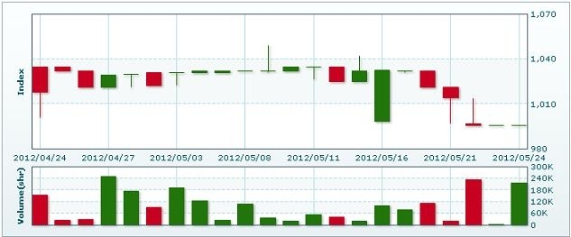 5月25日のラオス総合指数は前日比変わらずの995.62で取引を終えた。売買高は前日比83.9%減の3万5117株、売買代金は同87.0%減の1億6916万キープだった。