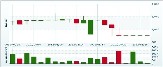 5月29日のラオス総合指数は2.67ポイント(0.27%)上昇し、998.29で取引を終えた。売買高は前日比3.6倍の4万2117株、売買代金は同3.1倍の2億2760万キープだった。