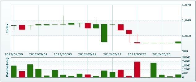5月30日のラオス総合指数は5.81ポイント(0.58%)上昇し、1004.1で取引を終えた。売買高は前日比39.3%減の2万5556株、売買代金は同31.9%減の1億5501万キープだった。