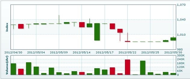 5月31日のラオス総合指数は7.14ポイント(0.71%)下落し、996.96で取引を終えた。売買高は前日比9.2倍の23万5550株、売買代金は同7.7倍の11億9392万キープだった。
