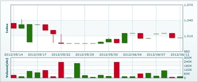 6月13日のラオス総合指数は前日比変わらずの1006.77で取引を終えた。売買高は前日比26.9%減の1万5714株、売買代金は同21.4%減の8198万3150キープだった。
