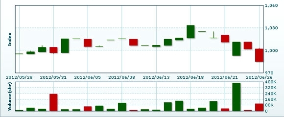 6月27日のラオス総合指数は4.53ポイント(0.46%)下落し、980.83で取引を終えた。売買高は前日比4.0倍の50万5290株、売買代金は同4.2倍の23億8789万キープだった。