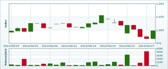 6月28日のラオス総合指数は17.98ポイント(1.83%)上昇し、998.81で取引を終えた。売買高は前日比98.2%減の9000株、売買代金は同98.3%減の4190万キープだった。