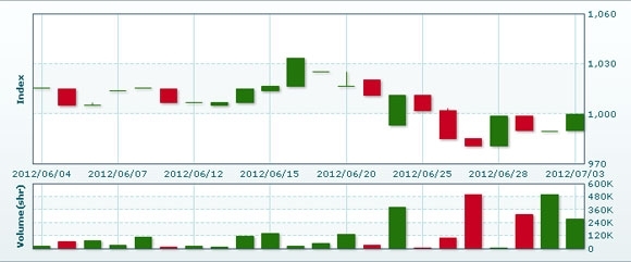 7月3日のラオス総合指数は10.12ポイント(1.02%)上昇し、999.94で取引を終えた。売買高は前日比46.0%減の27万1822株、売買代金は同46.0%減の12億6583万キープだった。
