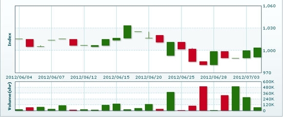 7月4日のラオス総合指数は3.39ポイント(0.34%)上昇し、1003.33で取引を終えた。売買高は前日比77.2%減の6万1984株、売買代金は同76.3%減の3億0008万だった。