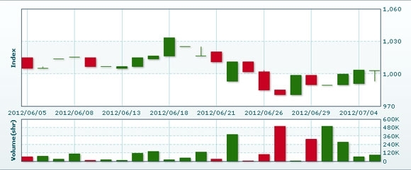 7月6日のラオス総合指数は前日比変わらずの1003.03で取引を終えた。売買高は前日比60.9%減の3万6497株、売買代金は同56.5%減の2億0340万キープだった。