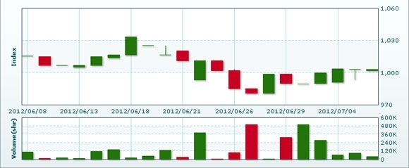 7月9日のラオス総合指数は8.98ポイント(0.90%)下落し、994.35で取引を終えた。売買高は先週末比3.5倍の12万7237株、売買代金は同3.0倍の6億0237万キープだった。