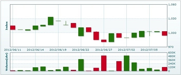 7月10日のラオス総合指数は1.13ポイント(0.11%)上昇し、995.48で取引を終えた。売買高は前日比79.2%減の2万6450株、売買代金は同78.2%減の1億3127万キープだった。