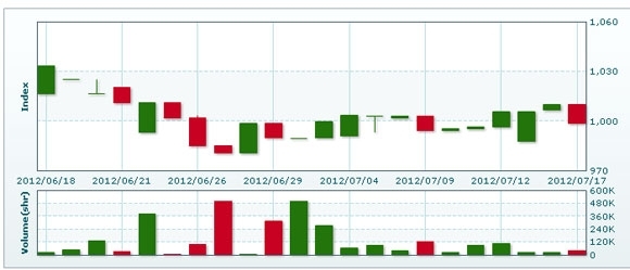 7月18日のラオス総合指数は▲1.13ポイント(0.11%)下落し、997.74で取引を終えた。売買高は前日比71.8%増の7万4247株、売買代金は同72.0%増の3億6800万キープだった。