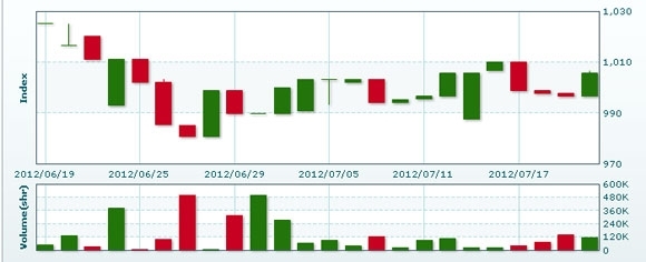 7月20日のラオス総合指数は前日比8.99ポイント(0.9%)高の1005.6で取引を終えた。売買高は前日比▲15.0%減の11万7649株、売買代金は同▲8.9%減の5億9597万キープだった。