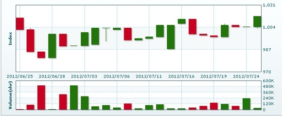 7月25日のラオス総合指数は前日比7.85ポイント(0.78%)高の1012.32で取引を終えた。売買高は前日比▲85.0%減の3万4430株、売買代金は同▲83.3%減の1億8746万キープだった。