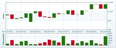 8月6日のラオス総合指数は先週末比+9.16ポイント(0.9%)高の1025.56で取引を終えた。売買高は先週末比約13倍の22万5652株、売買代金は同約13倍の10億7958万キープだった。