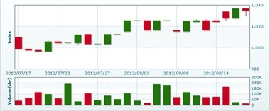 LSX総合指数は今週+9.17ポイント上昇した。月曜日から金曜日までの5営業日を合計した売買高は40万8109株、売買代金は22億6516万キープだった。1営業日当たりの売買高は8万1622株、1営業日当たりの売買代金は4億5303万キープだった。