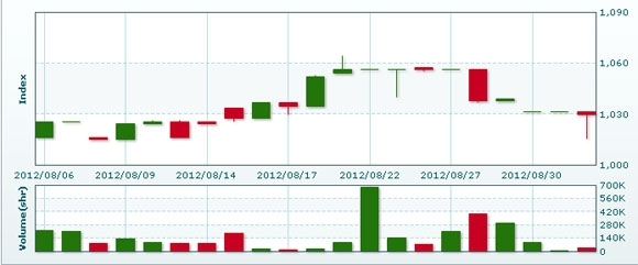 9月4日のラオス総合指数は前日比▲1.02ポイント(0.10%)安の1028.61で取引を終えた。売買高は前日比約2.4倍の9万0256株、売買代金は同約2.5倍の4億8282万キープだった。