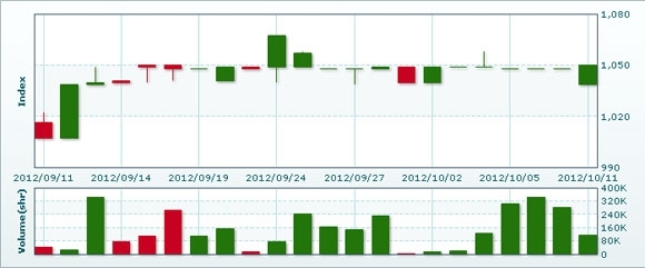 10月12日のラオス総合指数は前日比変わらずの1049.98で取引を終えた。売買高は前日比+74.6%増の19万8112株、売買代金は同+77.2%増の9億8388万キープだった。