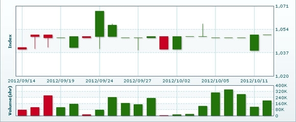 10月15日のラオス総合指数は先週末比▲1.02ポイント(0.10%)安の1048.96で取引を終えた。売買高は先週末比+35.6%増の26万8573株、売買代金は同+35.1%増の13億2903万キープだった。