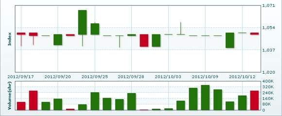10月16日のラオス総合指数は前日比変わらずの1048.96で取引を終えた。売買高は前日比+5.5%増の28万3210株、売買代金は同+4.4%増の13億8773万キープだった。
