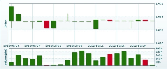 10月24日のラオス総合指数は前日比▲1.02ポイント(0.10%)安の1047.94で取引を終えた。売買高は前日比約4.1倍の5万2822株、売買代金は同約4.0倍の2億6017万キープだった。