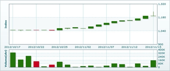 11月16日のラオス総合指数は前日比+36.61ポイント(3.06%)増の1233.05で取引を終えた。売買高は前日比▲69.0%減の4万8635株、売買代金は同▲68.5減の3億0621万キープだった。