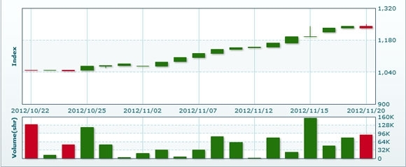 11月21日のラオス総合指数は前日比変わらずの1233.05で取引を終えた。売買高は前日比▲26.4%減の6万7152株、売買代金は同▲28.2%減の3億9856万キープだった。