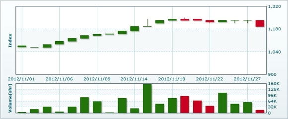 11月28日のラオス総合指数は前日比▲36.61ポイント(2.97%)安の1196.44で取引を終えた。売買高は前日比▲73.6%減の1万4860株、売買代金は同▲74.3%減の8519万キープだった。