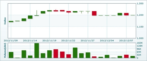 12月10日のラオス総合指数は先週末比変わらずの1198.48で取引を終えた。売買高は先週末比▲40.6%減1万9000株、売買代金は同▲44.5%減の1億0830万キープだった。