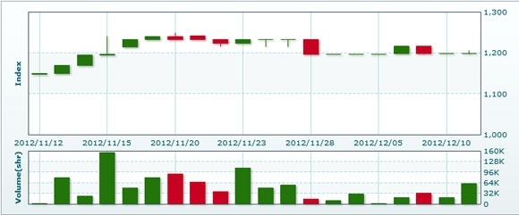 12月12日のラオス総合指数は前日比+9.15ポイント(0.76%)高の1207.63で取引を終えた。売買高は前日比▲78.2%減の1万3500株、売買代金は同▲71.7%減の1億0067万キープだった。