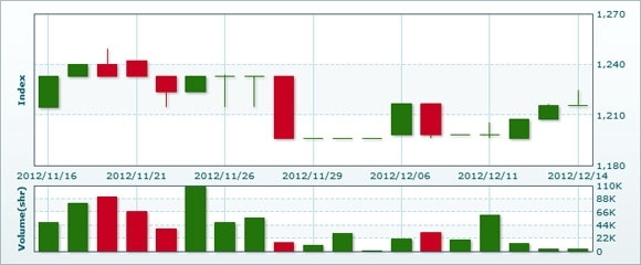 12月17日のラオス総合指数は先週末比▲10.17ポイント(0.84%)安の1205.59で取引を終えた。売買高は先週末比▲9.0%減4002株、売買代金は同▲4.6%減の2452万キープだった。