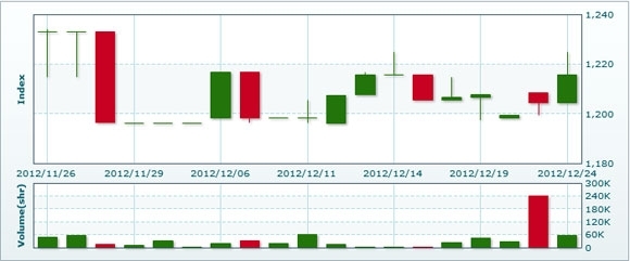 12月25日のラオス総合指数は前日比+8.13ポイント(0.67%)高の1223.92で取引を終えた。売買高は前日比▲89.7%減の5820株、売買代金は同▲86.9%減の4583万キープだった。