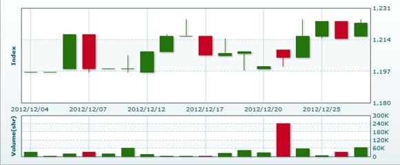1月3日のラオス総合指数は前日比変わらずの1222.90で取引を終えた。売買高は前日比▲37.7%減の4万1587株、売買代金は同▲34.1%減の2億6159万キープだった。