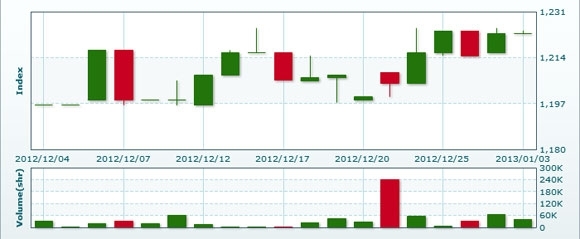 1月4日のラオス総合指数は前日比+9.15ポイント(0.75%)高の1232.05で取引を終えた。売買高は前日比▲66.8%減の1万3800株、売買代金は同▲68.9%減の8135万キープだった。
