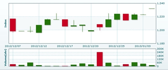 1月7日のラオス総合指数は先週末比+11.20ポイント(0.91%)高の1243.25で取引を終えた。売買高は先週末比▲47.5%減の7250株、売買代金は同▲47.0%減の4315万キープだった。