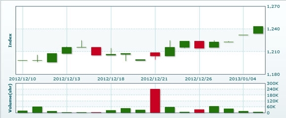1月8日のラオス総合指数は前日比▲2.04ポイント(0.16%)安の1241.21で取引を終えた。売買高は前日比約2.1倍の1万4893株、売買代金は同約2.1倍の8915万キープだった。