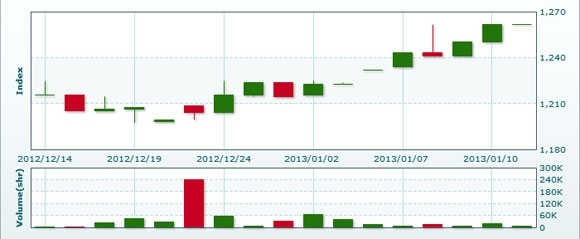 1月14日のラオス総合指数は先週末比+27.47ポイント(2.18%)高の1289.02で取引を終えた。売買高は先週末比約8.0倍の4万2016株、売買代金は同約7.1倍の2億5630万キープだった。